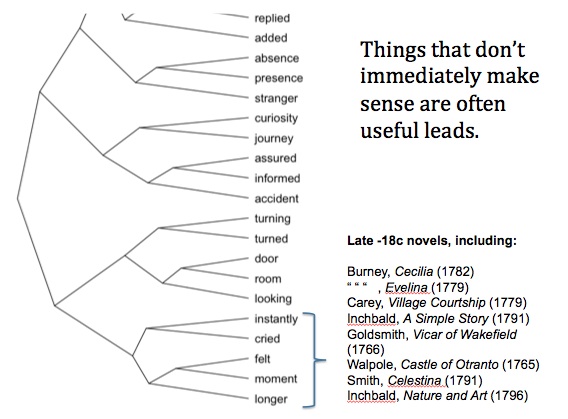 2) The second argument is newer; I don’t think I’ve blogged about it yet. I’m going to present topic modeling as a useful bridge between “distant” and “close” reading. I’ve found that I often learn most about a genre by modeling it as part of a larger collection that includes many other genres. In that context, a topic-modeling algorithm can highlight peculiar convergences of themes that characterize the genre relative to its contemporary backdrop. a slide from the talk, where a simple topic-modeling algorithm has been used to produce a dendrogram that offers a clue about the temporal framing of narration in late-18c novels