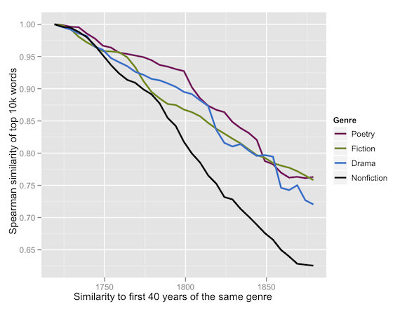 In isolation, a measure of similarity between two genres is hard to interpret. But if you run the test repeatedly to compare genres at different points in time, the changes can tell you when the diction of the genres becomes more or less similar.
