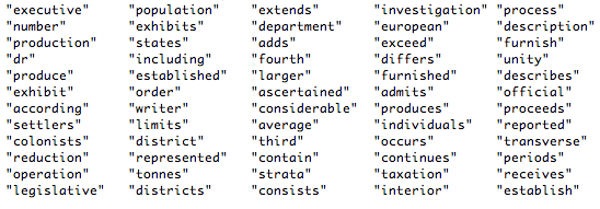 Looking at that list, I’m willing to venture out on a limb and suggest that fiction was specializing in subjectivity while nonfiction was tending to view the world from an increasingly social perspective (“executive, population, colonists, department, european, colonists, settlers, number, individuals, average.”)