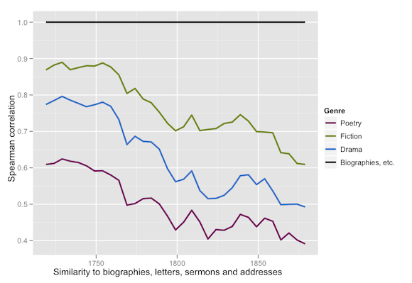 Here we’re comparing each genre to its own past. The language of nonfiction changes somewhat more rapidly than the language of the other genres, but none of them remain constant. There is no fixed reference point in this world, which is why I’m talking about the “differentiation” of two categories. But even granting that, we might want to pose another skeptical question: when literary genres become less like nonfiction, is that merely a sign of some instability in the definition of “nonfiction”? Did it happen mostly because, say, the nineteenth century started to publish on specialized scientific topics? We can address this question to some extent by selecting a more tightly defined subset of nonfiction as a reference point — say, biographies, letters, and orations.
