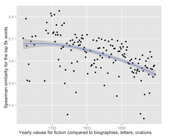 But really, this is a question that does need explanation. Literary scholars may hate the idea of “counting words,” but arguments about a distinctively “literary” language have been central to literary criticism from John Dryden to the Russian Formalists. If we can historicize that phenomenon — if we can show that a systematic distinction between literary and nonliterary language emerged at a particular moment for particular reasons — it’s a result that ought to have significance even for literary scholars who don’t consider themselves digital humanists.