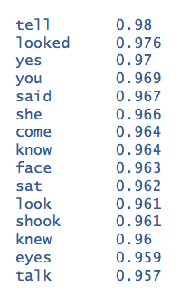In other words, we want to find the words that became overrepresented in fiction as fiction was becoming less like nonfiction prose. To find them, I compared fiction to nonfiction at five-year intervals between 1720 and 1880. At each interval I selected a 39-year slice of the collection and ranked words according to the extent to which they were consistently more prominent in fiction than nonfiction (using Mann-Whitney rho). After moving through the whole timeline you end up with a curve for each word that plots the degree to which it is over or under-represented in fiction over time. Then you sort the words to find ones that tend to become more common in fiction as the whole genre becomes less like nonfiction. (Technically, you’re looking for an inverse Pearson’s correlation, over time, between the Mann-Whitney rho for this word and the Spearman’s similarity between genres.) Here’s a list of the top 60 words you find when you do that: