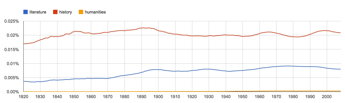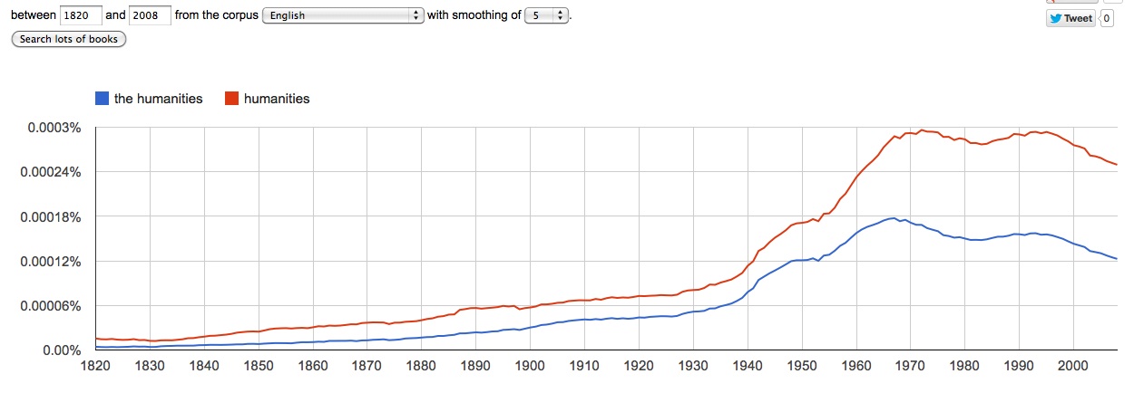 In research for a forthcoming book (Why Literary Periods Mattered, Stanford UP) I’ve poked around a bit in the institutional history of the early-twentieth-century university, and Harpham’s thesis rings true to me. Although the word has a pre-twentieth-century history, our present understanding of “the humanities” is strongly shaped by an institutional opposition between humanities and social sciences that only made sense in the twentieth century. For whatever it’s worth, Google Books also tends to support Harpham’s contention that the concept of the humanities has only possessed its present prominence since WWII.