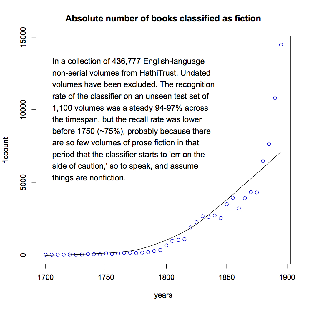 Acknowledgments: This research was supported by the Andrew W. Mellon Foundation through “Expanding SEASR Services” and “The Uses of Scale in Literary Study.” Loretta Auvil, Mike Black, and Boris Capitanu helped develop resources for normalizing 18/19c OCR, many of which are public at usesofscale.com. Jordan Sellers developed the initial training corpus of 19c documents categorized by genre.