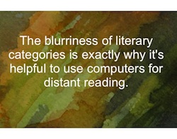 This is the darkest moment of this post. It may seem that there’s no hope for literary historians. How can we ever know anything if we can’t even agree on the definitions of basic concepts like genre and point of view? But here’s the crucial twist — and the real center of what I want to say. The blurriness of literary categories is exactly why it’s helpful to use computers for distant reading. With an algorithm, we can classify 500,000 volumes provisionally. Try defining point of view one way, and see what you get. If someone else disagrees, change the definition; you can run the algorithm again overnight. You can’t re-run a crowdsourced cataloguing project on 500,000 volumes overnight.