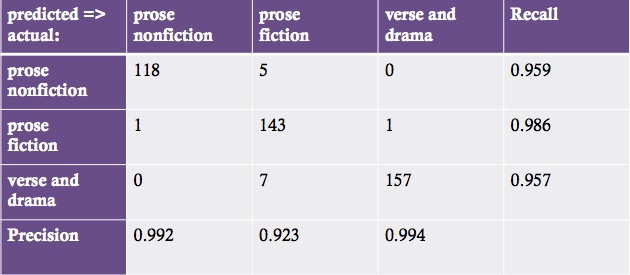 These results are pretty good, but that’s partly because this test corpus didn’t have a lot of miscellaneous collected works in it. In reality you see a lot of volumes that are a mosaic of different genres — the collected poems and plays of so-and-so, prefaced by a prose life of the author, with an index at the back. Obviously if you try to classify that volume as a single unit, it’s going to be a muddle. But I think it’s not going to be hard to use genre classification itself to segment volumes, so that you get the introduction, and the plays, and the lyric poetry sorted out as separate documents. I haven’t done that yet, but it’s the next thing on my agenda.