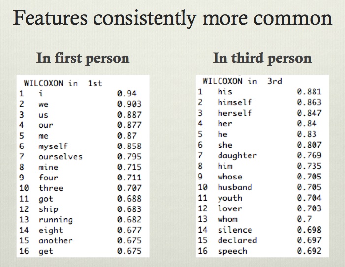 What about the question we started with — first-person narration? I approach this the same way I approached genre classification. I trained a classifier on 290 texts that were clearly dominated by first- or third-person narration, and used a Wilcoxon test to select features that are consistently more common in one set or in the other.