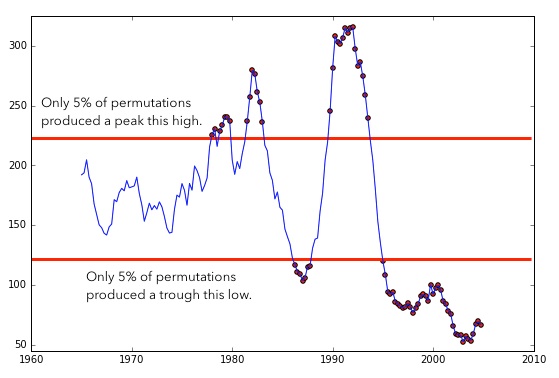 Tying musical revolutions to particular years (and making 1991 more important than 1964) won the article a lot of attention in the press. Underwood’s questions about these claims last October stirred up an offline conversation with three researchers at the University of Chicago, who have joined this post as coauthors. After gathering in Hyde Park to discuss the question for a couple of days, we’ve concluded that “The Evolution of Popular Music” overstates its results, but is also a valuable experiment, worth learning from. The article calculates significance in a misleading way: only two of the three “revolutions” it reported are really significant at p < 0.05, and it misses some odd periods of stasis that are just as significant as the periods of acceleration. But these details are less interesting than the reason for the error, which involved a basic challenge facing quantitative analysis of history.