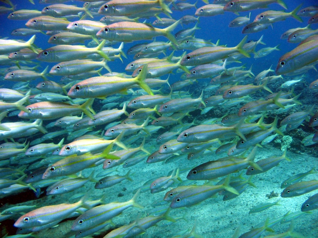 Photo credit: A school of yellow-tailed goatfish, photo for NOAA Photo Library, CC-BY Dwayne Meadows, 2004.