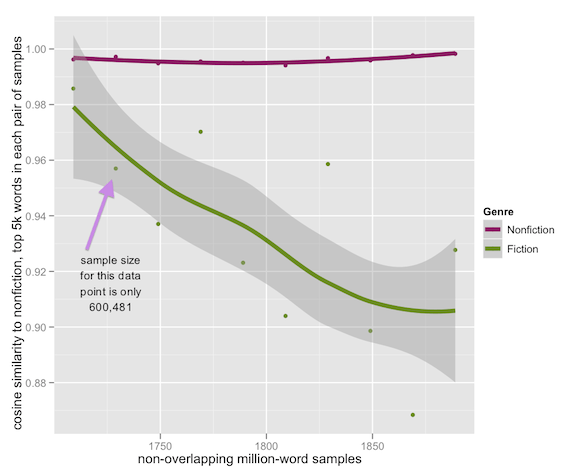 It’s impossible to interpret a comparative result like this purely as evidence about one side of the comparison. We’re looking at a process of differentiation that involves changes on both sides: the language of nonfiction and fiction, for instance, may both have specialized in different ways.
