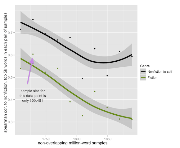 This strongly supports the conclusion that fiction was becoming less like nonfiction, but also reveals that the internal homogeneity of the nonfiction corpus was decreasing, especially in the 18c. So some of the differentiation between fiction and nonfiction may be due to the internal diversification of nonfiction prose.
