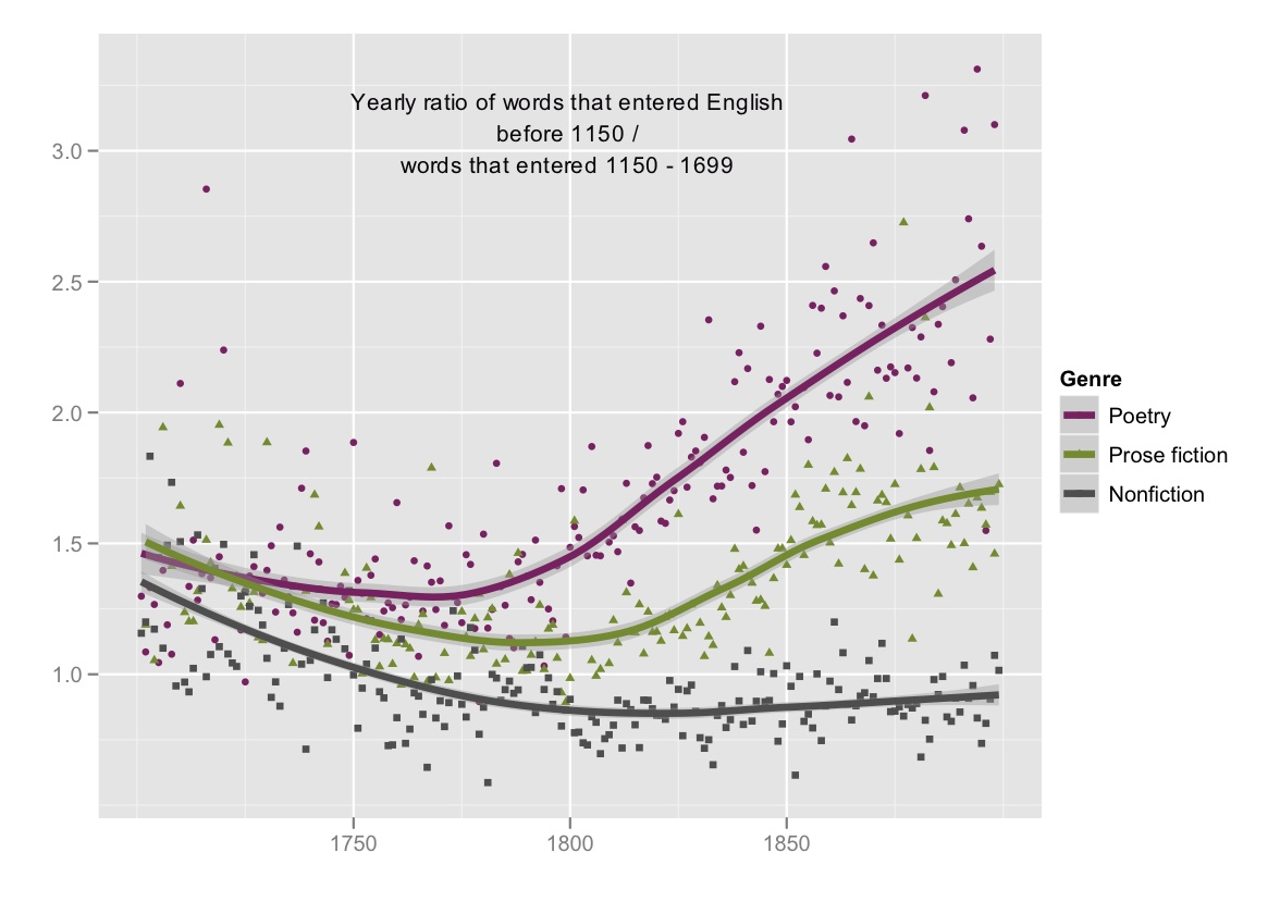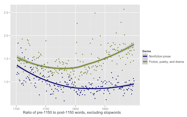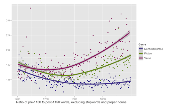 There’s a lot more to investigate here. In my original post I tried to identify some of the words that became more common in fiction as it became less like nonfiction. I’d like to run that again, in order to explain why fiction and poetry became more similar to each other. But I’ll save that for another day. I do want to offer one specific metric that might help us explain the differentiation of “literary” and “nonliterary” diction: the changing etymological character of the vocabulary in these genres.