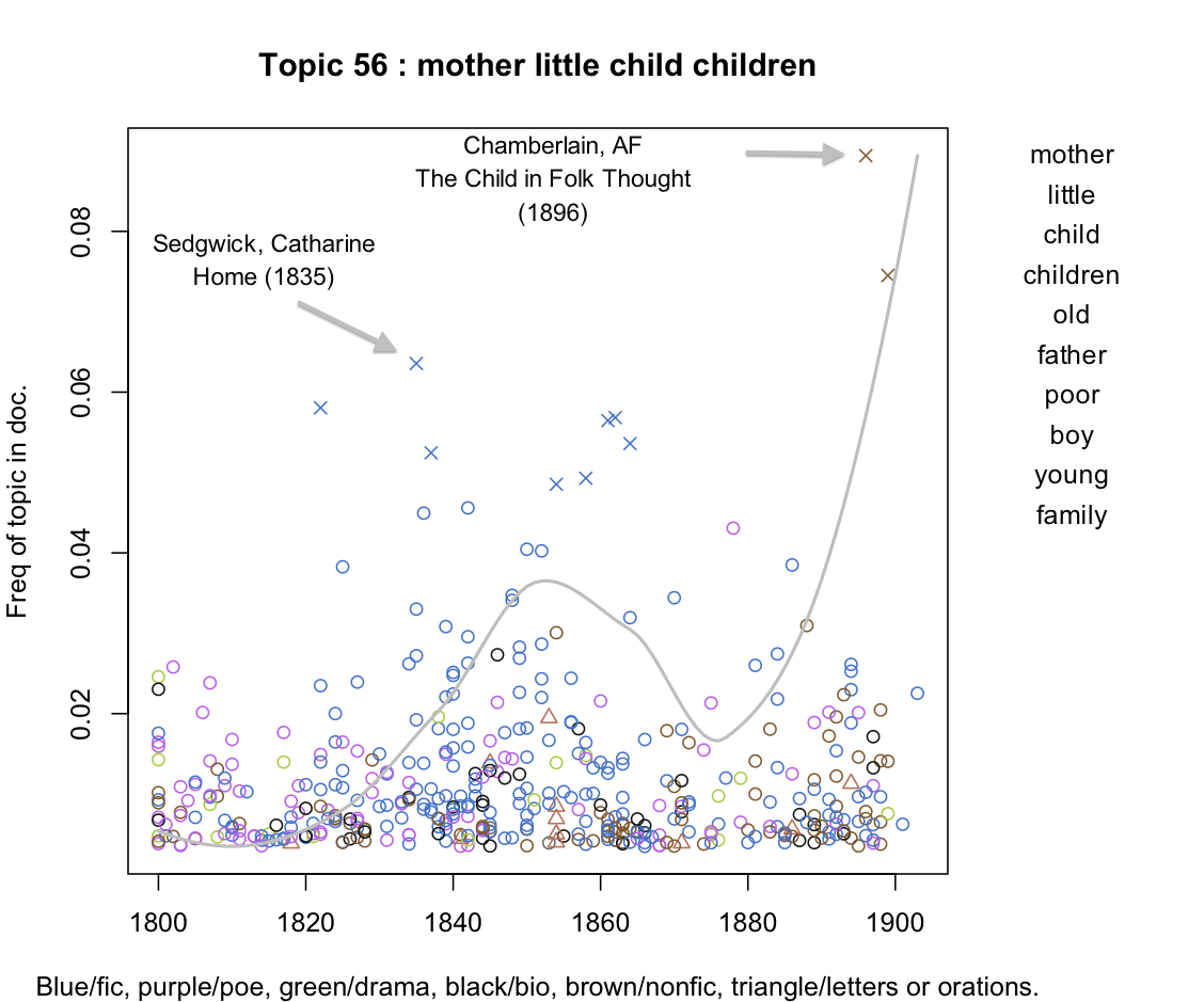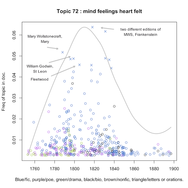 But here’s what I find slightly moving. The x’s at the top of the graph are the 10 works in the collection where the topic was most prominent. They include, in order, Mary Wollstonecraft Shelley, Frankenstein, Mary Wollstonecraft, Mary, William Godwin, St. Leon, Mary Wollstonecraft Shelley, Lodore, William Godwin, Fleetwood, William Godwin, Mandeville, and Mary Wollstonecraft Shelley, Falkner.