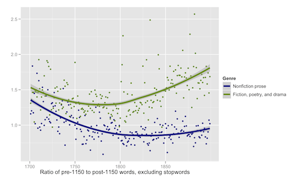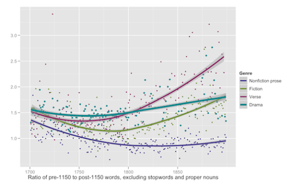 The older part of the lexicon (mostly words derived from Old English) gradually became more common in poetry, fiction, and drama than in nonfiction prose. This may not be the only reason for growing differentiation between literary and nonliterary language, but it seems worth exploring. (I should note that function words are excluded from this calculation for reasons explained below; we’re talking about verbs, nouns, and adjectives — not about a rising frequency of “the.”)