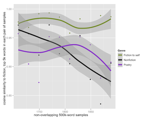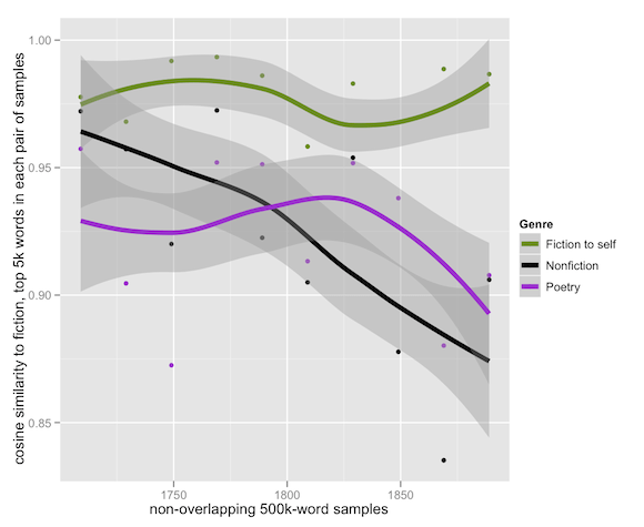 This graph is a little wriggly, and the underlying data points are pretty bouncy — because fiction is internally diverse when measured by cosine similarity, and it makes a rather bouncy reference point. But through all of that I think one key fact does emerge: by this measure, fiction looks more similar to nonfiction prose in the eighteenth century, and more similar to poetry in the nineteenth.