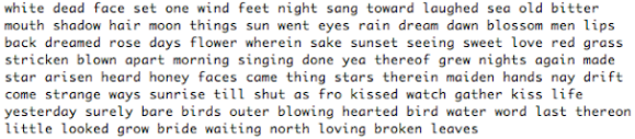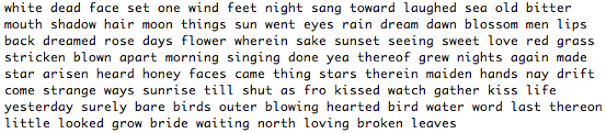 It’s not, however, simply a list of common Anglo-Saxon words. The list clearly reflects a particular model of “poetic diction,” although the nature of that model is not easy to describe. It involves an odd mixture of nouns for large natural phenomena (wind, sea, rain, water, moon, sun, star, stars, sunset, sunrise, dawn, morning, days, night, nights) and verbs that express a subjective relation (sang, laughed, dreamed, seeing, kiss, kissed, heard, looked, loving, stricken). [Afterthought: I don’t think we have any Hopkins in our collection, but it sounds like my computer is parodying Gerard Manley Hopkins.] There’s also a bit of explicitly archaic Wardour Street in there (yea, nay, wherein, thereon, fro).