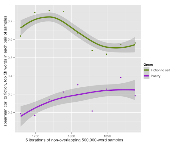 Poetry and fiction are becoming more similar in the period 1720-1900. I should note that I’ve dropped the first datapoint, for the period 1700-1719, because it seemed to be an outlier. Also, we’re using a smaller sample size here, because my poetry collection won’t support 1 million word samples across the whole period. (We have stripped the prose introduction and notes from volumes of poetry, so they’re small.)