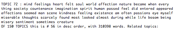 Other critics have of course noticed that M. W. Shelley writes “Godwinian novels.” And if you go further down the list of works, the picture becomes less familial (Helen Maria Williams and Thomas Holcroft butt in, as well as P. B. Shelley). Plus, there’s another topic in the model (“myself these should situation”) that links William Godwin more closely to Charles Brockden Brown than it does to his wife or daughter. And LDA isn’t graven on stone; every time you run topic modeling you’re going to get something slightly different. But still, this is kind of a cool one. “Mind feelings heart felt” indeed.