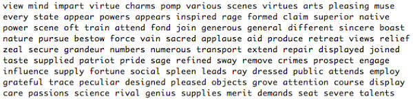 But the precise correlation coefficients don’t matter as much as an overall picture of diction, so I’ll simply list the hundred words that correlate most strongly with the pre/post-1150 ratio in poetry from 1755 to 1900: