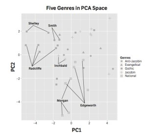 b) (Supervised) classification: a program can learn to correctly distinguish texts by a given author, or learn (with a bit more difficulty) to distinguish poetry from prose, tragedies from history plays, or “gothic novels” from “sensation novels.” (See “Quantitative Formalism,” Pamphlet 1 from the Stanford Literary Lab.) The researcher has to provide examples of different categories, but doesn’t have to specify how to make the distinction: algorithms can learn to recognize a combination of features that is the “fingerprint” of a given category.