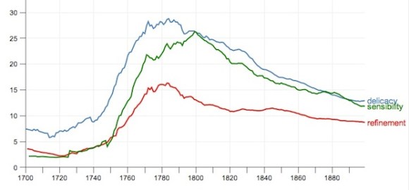The best-known example here would be Google’s ngram viewer. Digital humanists love to criticize the ngram viewer, partly for valid reasons (there’s no way to know what texts are being used). But it has probably been the single most influential application of text mining, so clearly people are finding this simple kind of diachronic visualization useful. A couple of other projects have built on the same dataset, slicing it in different ways. Mark Davies of BYU built an interface that lets you survey the history of collocations. Our team at Illinois built an interface that mines 18-19c correlations in the ngram dataset; it turns out that correlated words have a high likelihood of being related in other ways as well, and these can be intriguing leads: see what words correlate with “delicacy” in our period, for instance. Harvard has built Bookworm, which can be understood as a smaller but more flexible and better-documented version of the ngram viewer (built on the Open Library instead of Google Books).