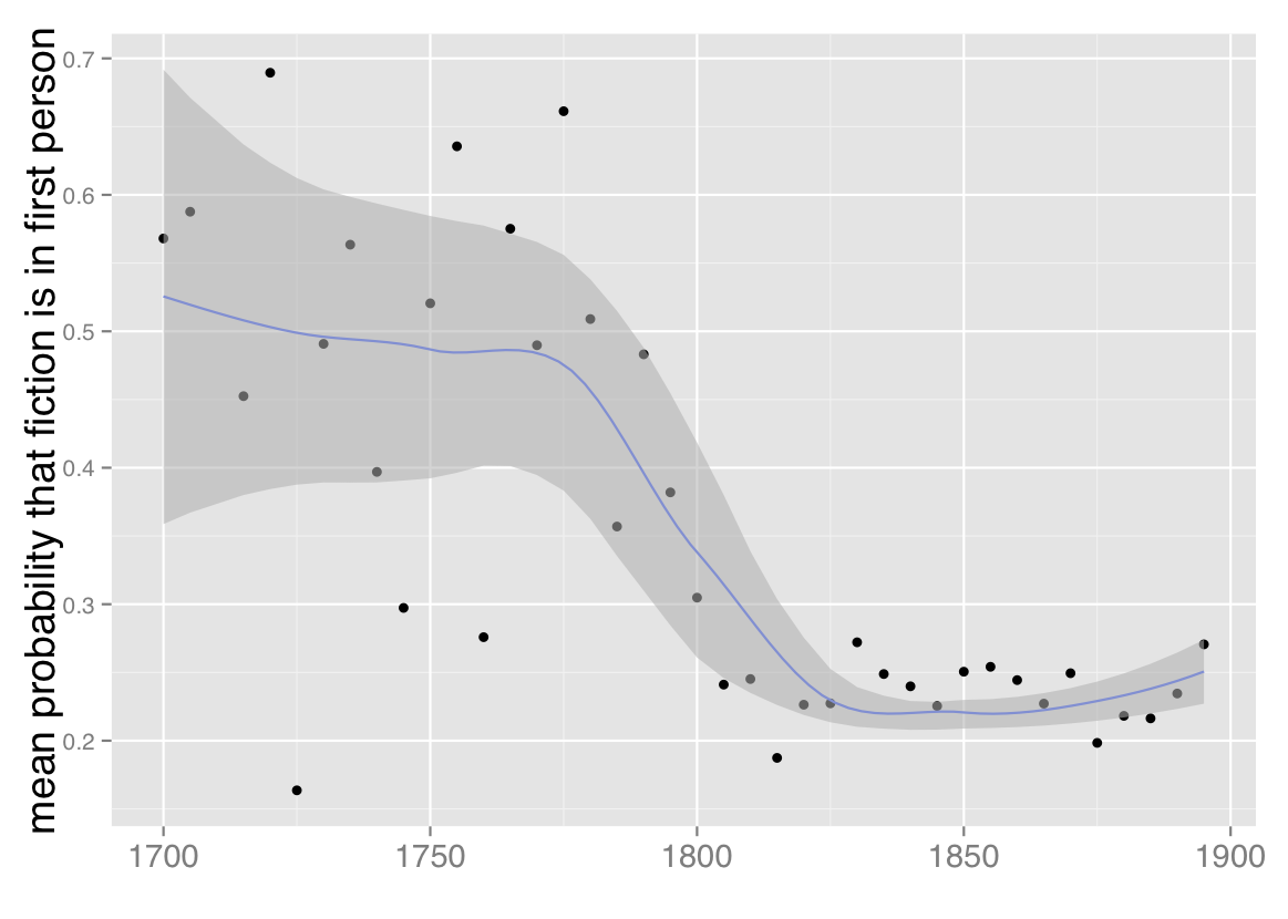 Mean probability that fiction is written in first person, 1700-1899. Based on a corpus of 32,209 volumes of fiction extracted from HathiTrust Digital Library. Points are mean probabilities for five-year spans of time; a trend line with standard errors has been plotted with loess smoothing.