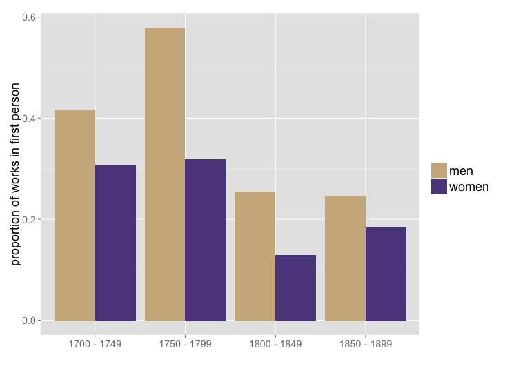 Proportion of works of fiction by men and women in first person. Based on the same set of 774 volumes described above. (This figure counts strictly by the number of works rather than weighting works by the number of words they contain.)