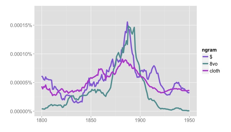 Frequencies of “$”, “8vo” (octavo) and “cloth” in Google’s “English Fiction” collection, 1800-1950.