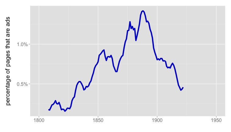 Percentage of pages in mostly-fiction volumes that are ads. Based on a filtered collection of 102,349 mostly-fiction volumes selected from a larger group of 854,476 volumes 1700-1922. Five-year moving average.
