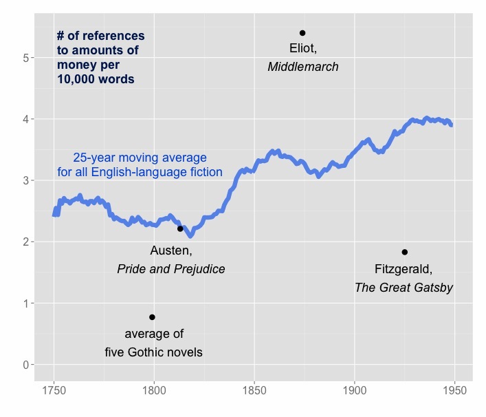 Frequency of reference to “specific amounts” of money in 7,700 English-language works of fiction. Graphics here and throughout from Wickham, ggplot2 [2].