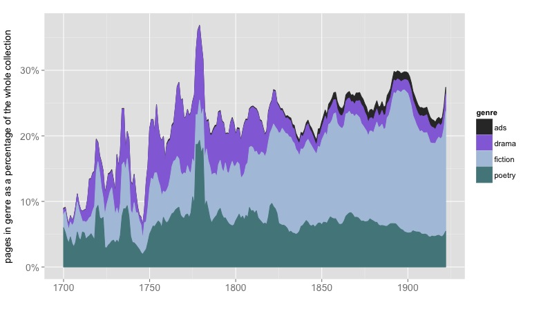 First of all, why is dividing by genre even a problem? Well, most machine-readable catalog records don’t say much about genre, and even if they did, a single volume usually contains multiple genres anyway. (Think introductions, indexes, collected poems and plays, etc.) With support from the ACLS and NEH, I’ve spent the last year wrestling with that problem, and in a couple of weeks I’m going to share an imperfect page-level map of genre for English-language books in HathiTrust 1700-1923.