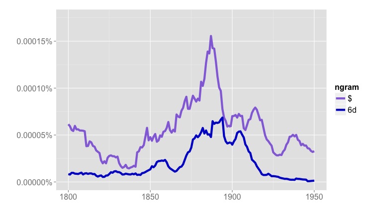 Frequencies of “$” and “6d” in Google’s “English Fiction” collection, 1800-1950.