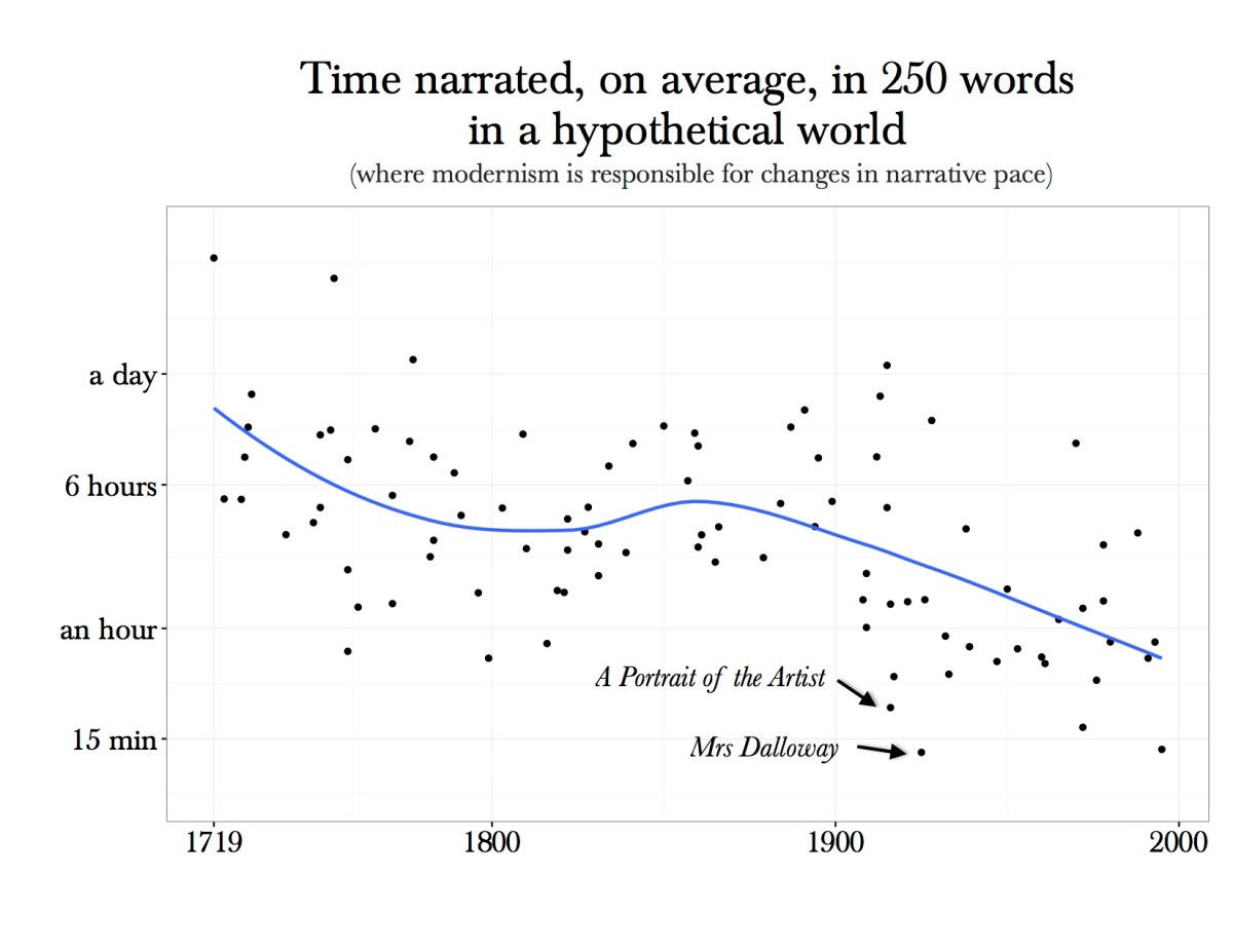 We ask how much fictional time is narrated, on average, in 250 words. We discover some dramatic changes across a timeline of 300 years, and I’m tempted to include our results as an illustration here. But I’ve decided not to, because I want to explore whether scholars already, intuitively know how the representation of duration has changed, by asking readers to reflect for a moment on what they expect to see.