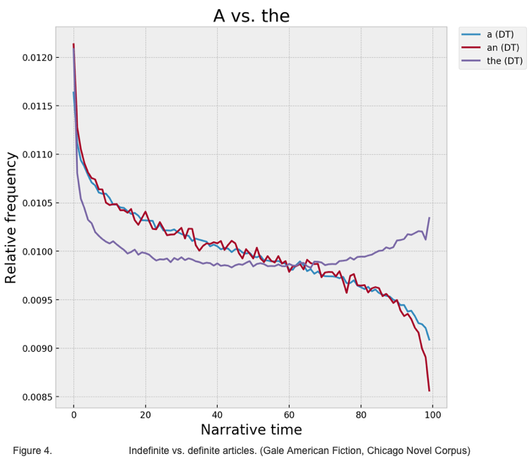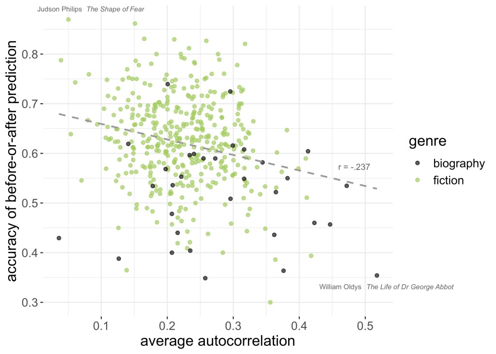 Right now, distant reading can’t fully answer any of these questions. When we want to measure surprise or novelty, for instance, we typically measure change in the verbal texture of a story from beginning to end. I made a coarse attempt of that kind in a blog post a few years ago. Other articles use better methods, and give us new ways to think about form (McGrath et al. 2018, Piper et al. 2023). But how closely does the pace of verbal change correlate with readers’ experience of uncertainty or surprise? We don’t know.