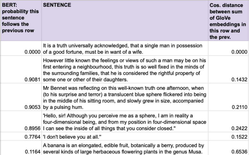 When I did this for two novels that were complete blanks to me, my predictions tended to diverge from the actual course of the story in roughly the same places where the model found prediction difficult. So there does seem to be some relationship between a language model’s (in)ability to see what’s coming and a human reader’s.