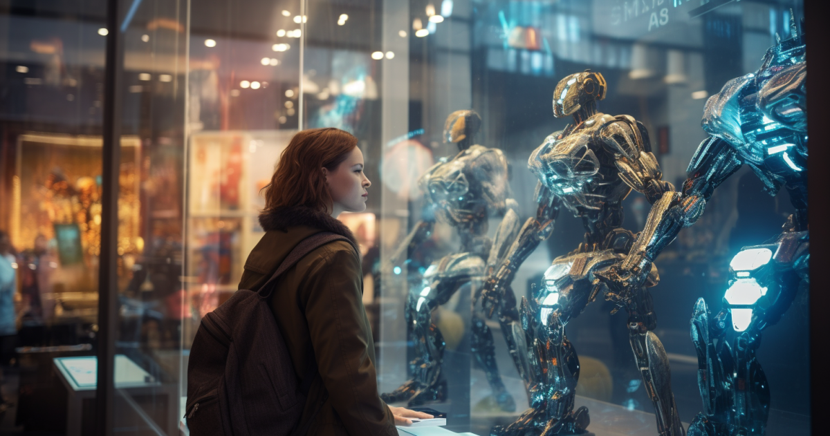 Midjourney: “a college student looking at helpful utility robots in a department store window, HD photography, 80 mm lens –ar 17:9“