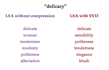 Here’s a quick look at the results. (I’m using 2,193 18c volumes, mostly produced by TCP-ECCO; volumes that run longer than 100,000 words get broken into chunks that can range from 50k-100k words.) In many cases, the differences between LSA with and without compression are not very great. In the case of “delicacy,” for instance, both algorithms indicate that “delicate” has the strongest association. “Politeness” and “tenderness” are also very high on both lists. But compare the second row. The algorithm with compression produces “sensibility” — a close synonym. On the left-hand side, we have “woman.” This is not a synonym for “delicacy,” and if a linguist or computer scientist were evaluating these algorithms, it would probably be rejected as a mistake. But from a literary-historical point of view, it’s no mistake: the association between “delicacy” and femininity is possibly the most interesting fact about the word.