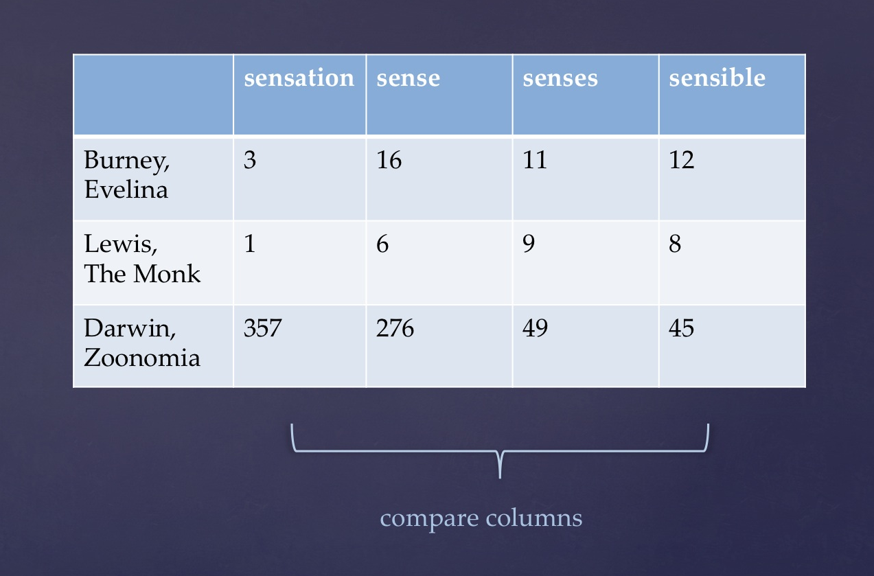 I’ll return in a moment to this point. It has important implications, because it means that we want LSA to do something slightly different than linguists and information scientists have designed it to do. The “flaws” they have tried to iron out of the technique may not always be flaws for our purposes.