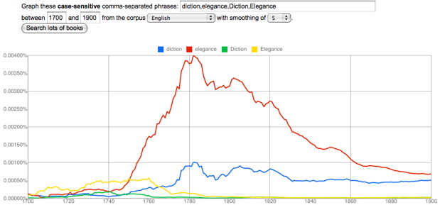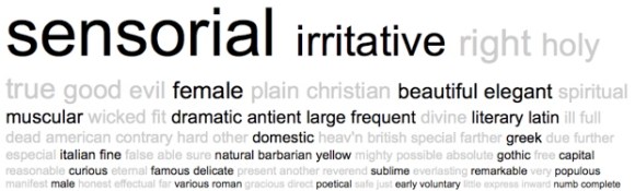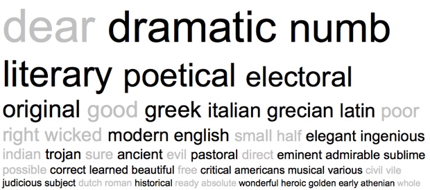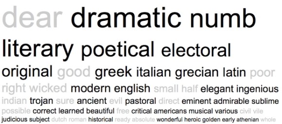 I haven’t tested that yet, but I have tried another kind of test, to rule out the possibility that we’re simply rediscovering the same trends that generated the topics in the first place. Since the Google dataset is very large, you can also test whether 18c topics continue to cohere as trends in the nineteenth century. As it turns out, they do — and in fact, they cohere slightly more strongly! (In the 19c, 88 out of 200 18c topics cohered significantly as trends.) The improvement is probably a clue that Google’s dataset gets better in the nineteenth century (which god knows, it does) — but even if that’s true, the 19c result would be significant enough on its own to show that topic modeling has considerable predictive power.