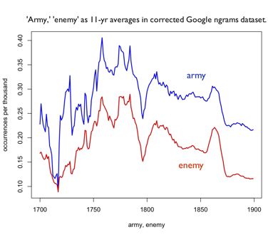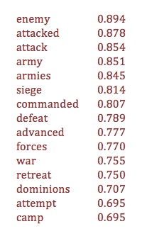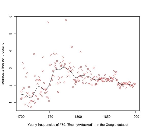 By contrast, here’s the trend curve for topic #89, “Enemy/Attacked,” which is largely used in describing warfare. It doesn’t change frequency markedly from beginning to end; instead it bounces around from decade to decade with a lot of wild outliers. But it is in practice a very tightly-knit trend: a pair of words selected from this topic will have on average 31% of their variance in common. The peaks and outliers are not random noise: they’re echoes of specific armed conflicts.