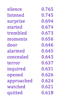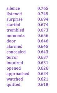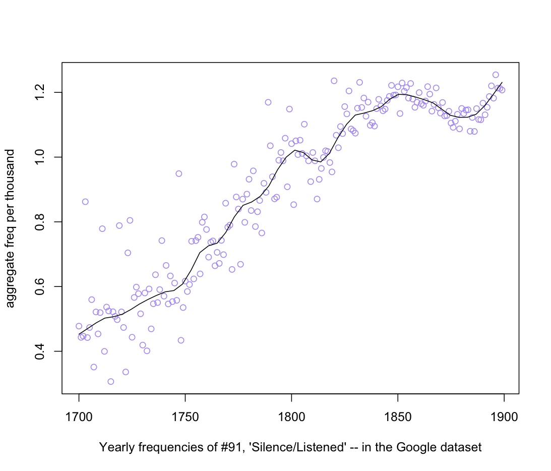 For instance, here’s the trend curve for topic #91, “Silence / Listened,” which is linked to the literature of suspense, and increases rather gradually and steadily from 1700 to the middle of the nineteenth century.