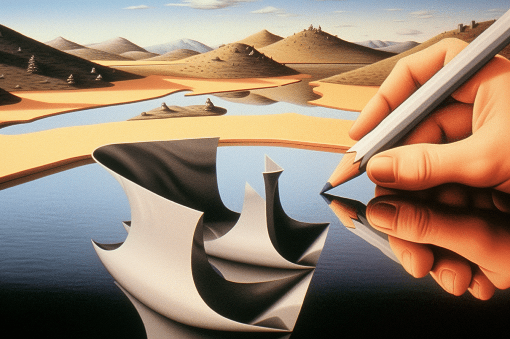 Midjourney: “a hand writing with a quill reflected in a mirror, by MC Escher, in the style of meta-representation –ar 3:2 –weird 50”